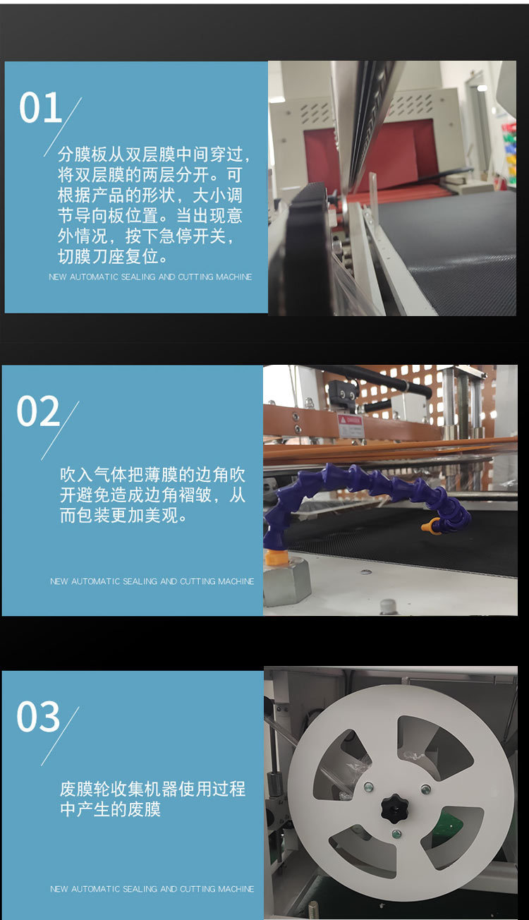 全自動(dòng)封切機(jī)主要是通過一系列自動(dòng)化的機(jī)械和電子控制部件協(xié)同工作來完成包裝封切任務(wù)。首先,將產(chǎn)品放置在傳送帶上,傳送帶將產(chǎn)品輸送到封切區(qū)域。當(dāng)產(chǎn)品到達(dá)指定位置后,封切裝置開始工作。封切裝置中的加熱元件會(huì)迅速升溫,使包裝材料(如塑料薄膜)在封口處受熱熔化。同時(shí),切割裝置會(huì)在封口完成后按照預(yù)設(shè)的尺寸對(duì)包裝材料進(jìn)行切割,從而完成一個(gè)產(chǎn)品的包裝封切過程。整個(gè)過程是由機(jī)器內(nèi)部的控制系統(tǒng)進(jìn)行精確控制,包括傳送帶的速度、封切的時(shí)間和溫度等參數(shù),都可以根據(jù)不同的包裝要求進(jìn)行調(diào)節(jié)。 結(jié)構(gòu)組成 傳送系統(tǒng):這是全自動(dòng)封切機(jī)的基礎(chǔ)