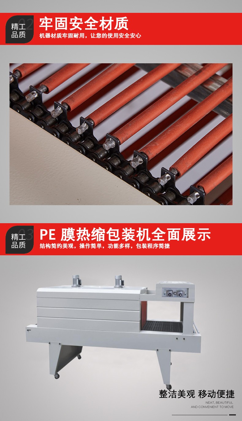 加熱原理:機(jī)器內(nèi)部的加熱裝置(通常是加熱管)會將空氣加熱。當(dāng) PE 薄膜包裹產(chǎn)品并進(jìn)入加熱區(qū)域后,熱空氣使薄膜分子獲得能量。PE 薄膜分子鏈在熱能作用下開始運(yùn)動,分子間的距離縮小,進(jìn)而產(chǎn)生收縮現(xiàn)象。一般來說,PE 薄膜的收縮溫度在