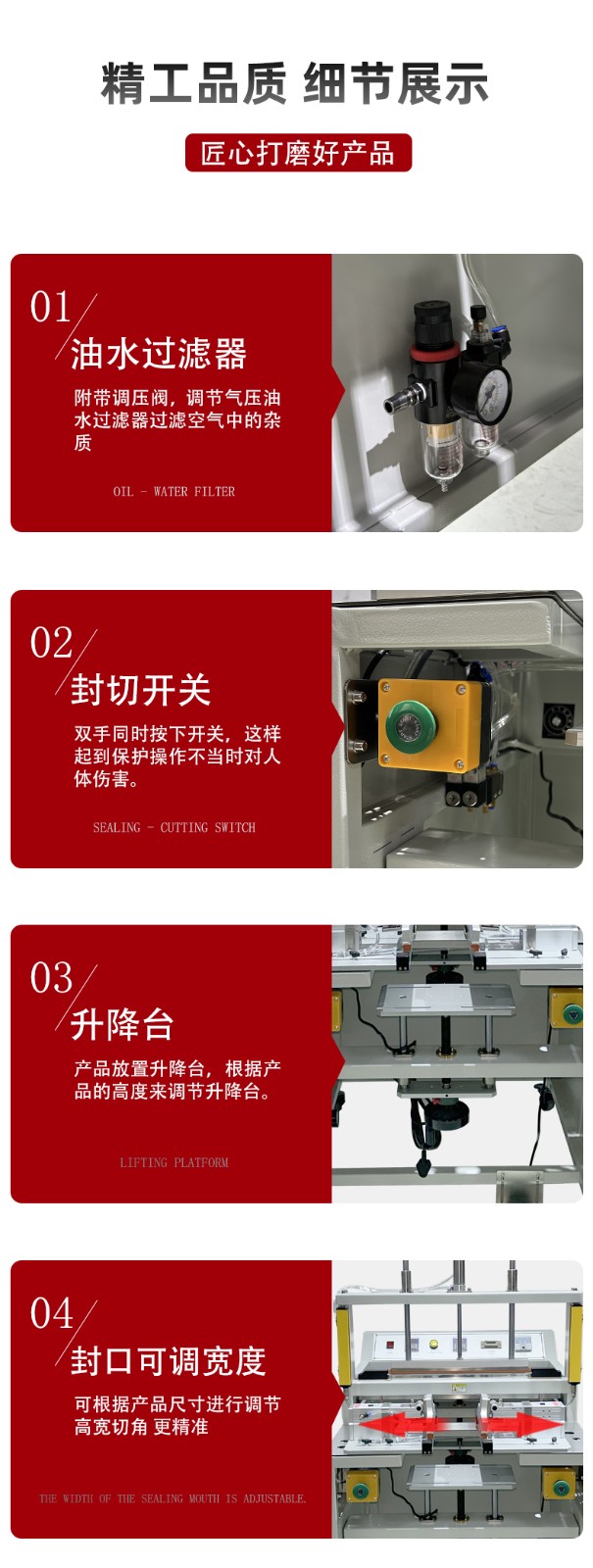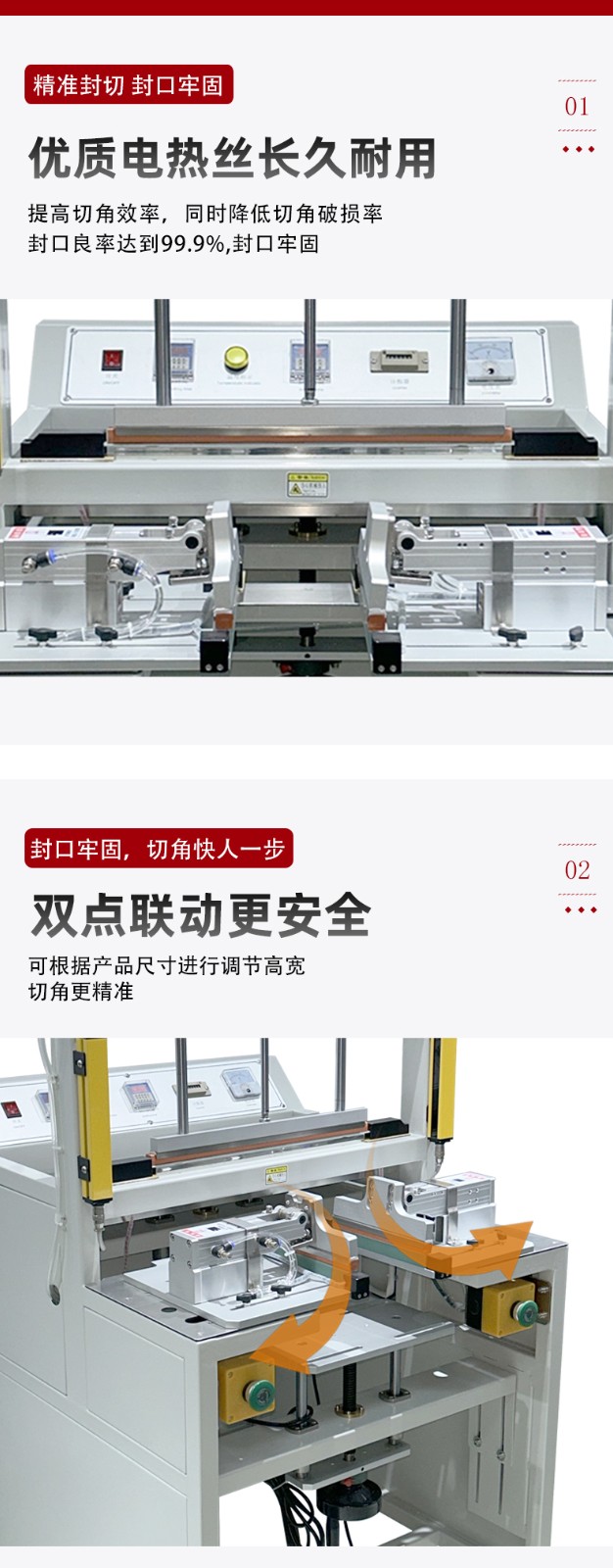 • 質(zhì)量可靠:熱封技術和優(yōu)質(zhì)封刀材料保證封口牢固、平整、美觀與良好密封性;精確控制切角角度和尺寸,切角一致性和準確性高。