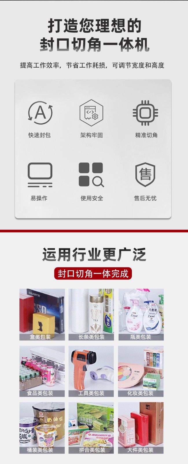 • 高效自動化:自動完成封口和切角工序,提升生產(chǎn)效率,降低人工成本,如在食品、日用品等大規(guī)模包裝生產(chǎn)中優(yōu)勢明顯。