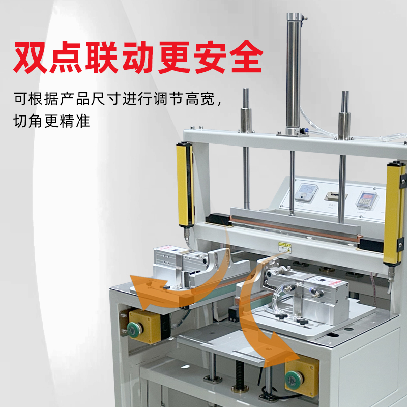 • 切角原理:借助刀具或模具,在封口完成后,由機械傳動或氣動裝置驅(qū)動刀具,按預設角度和尺寸對包裝邊角切割,形成所需切角形狀。