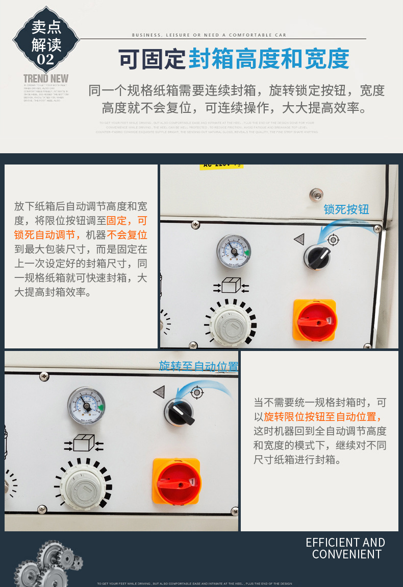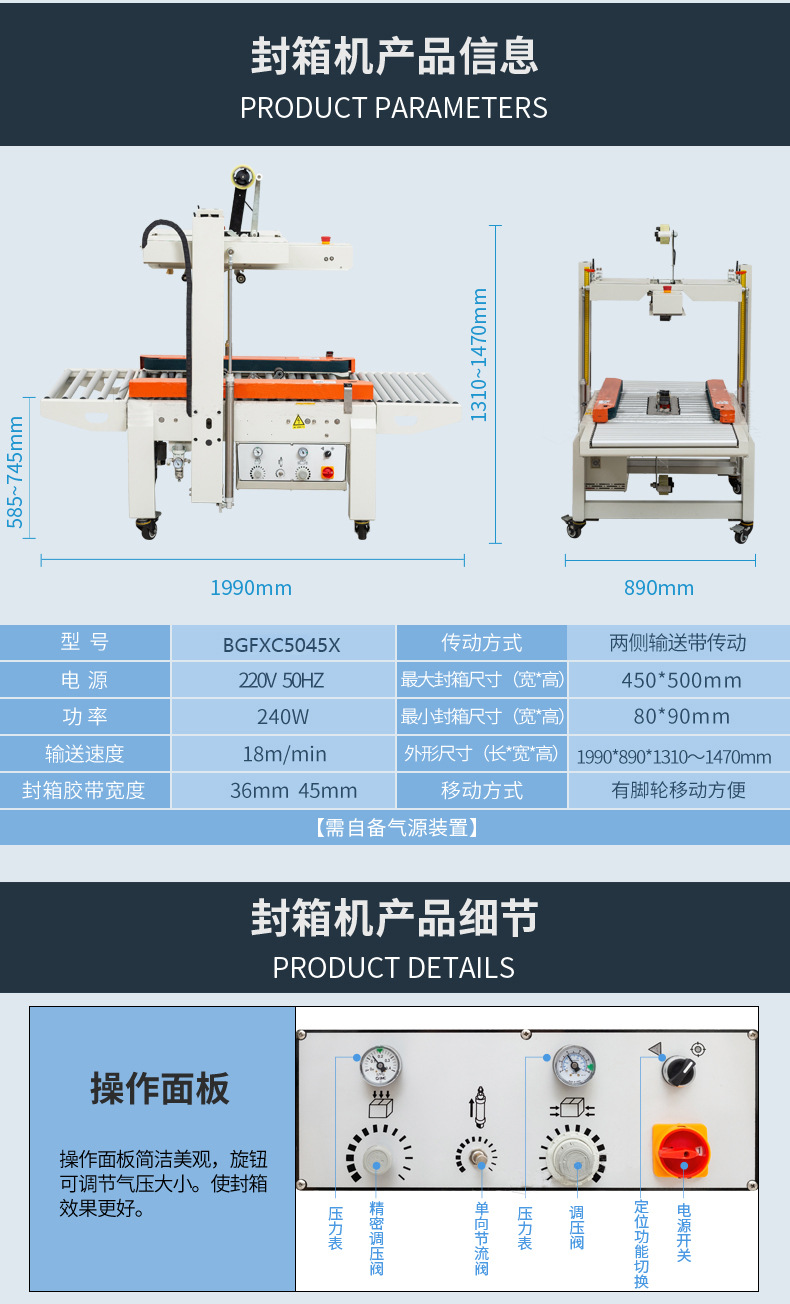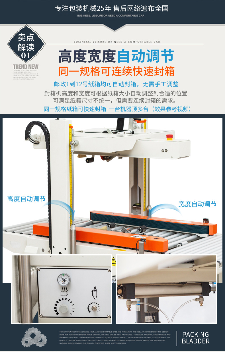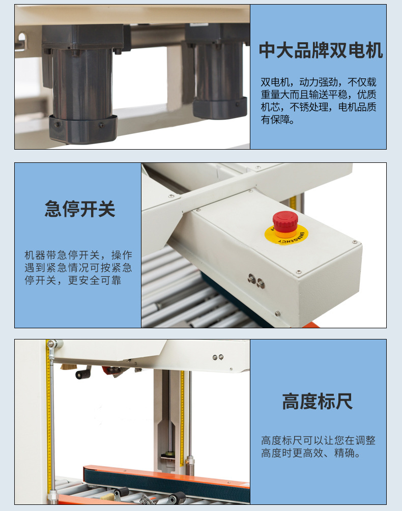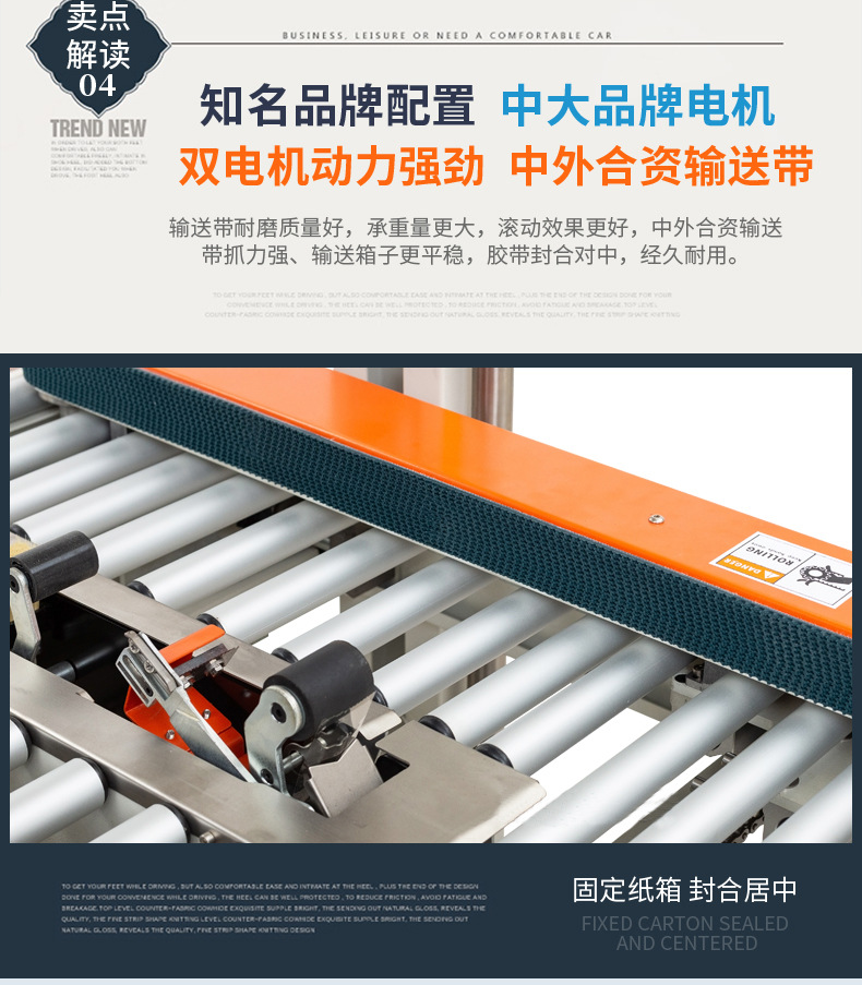 PRODUCT CENTER封箱機(jī),也稱為Case sealer machine,主要用于紙箱的封箱包裝。它們不僅適用于單機(jī)作業(yè),也可以與流水線配套使用,是包裝流水線作業(yè)中不可或缺的設(shè)備。封箱機(jī)的功能包括自動折疊、粘合和封口紙箱,通過先進(jìn)的感應(yīng)和控制技術(shù),能夠自動檢測和調(diào)整紙箱尺寸,按照設(shè)計(jì)要求進(jìn)行折疊和封口操作,大大提高了包裝的效率和一致性,減少了人工操作的錯(cuò)誤和勞動強(qiáng)度。